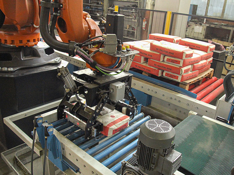 Trong các nhà máy sản xuất keo dán gạch và vữa xây dựng, công đoạn gắp bao và xếp pallet là một trong những bước tốn nhiều nhân công nhất. Bao thành phẩm nặng từ 10 đến 50 kg, mật độ đóng gói cao liên tục trong ngày, dễ gây mệt mỏi, chấn thương lao động và sai lệch xếp pallet.